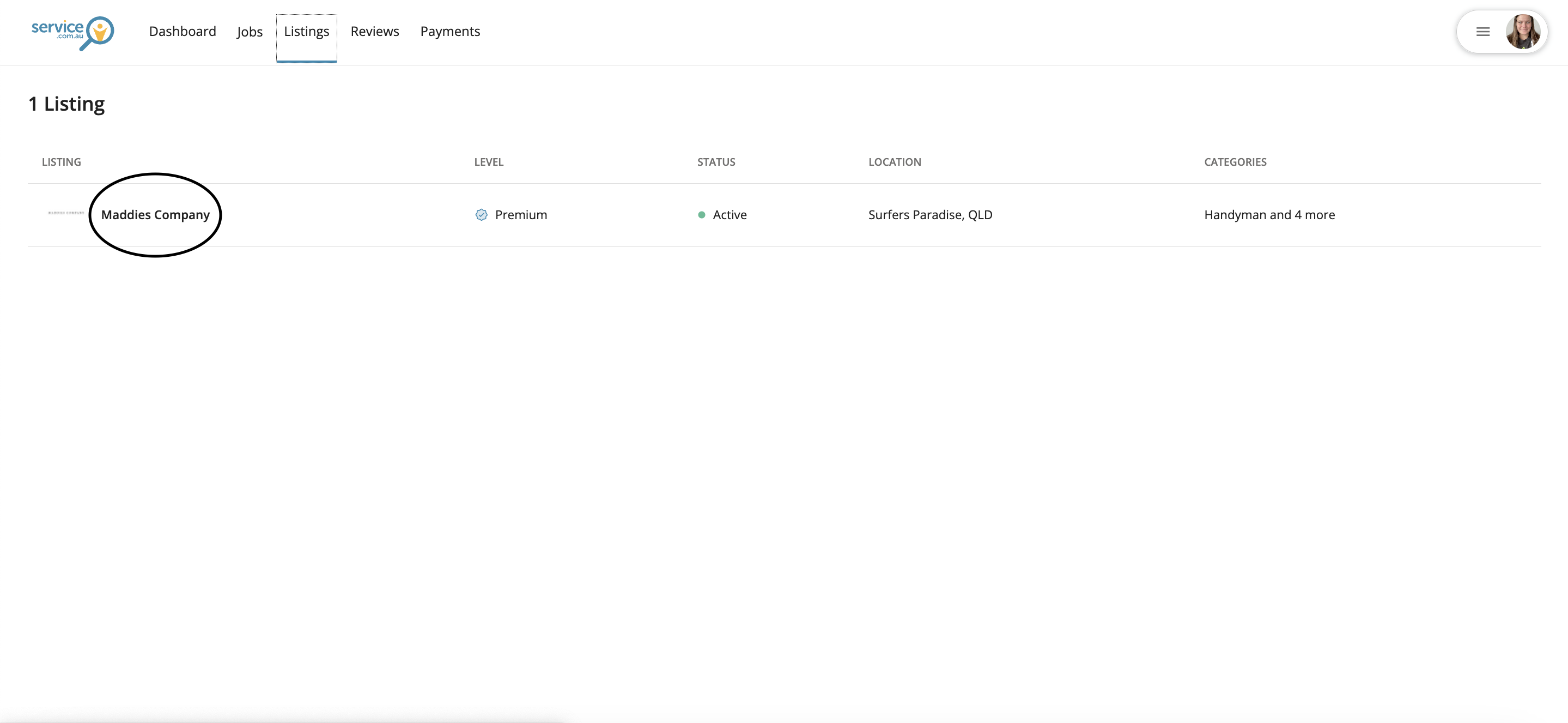 A business name selected from the Listings page