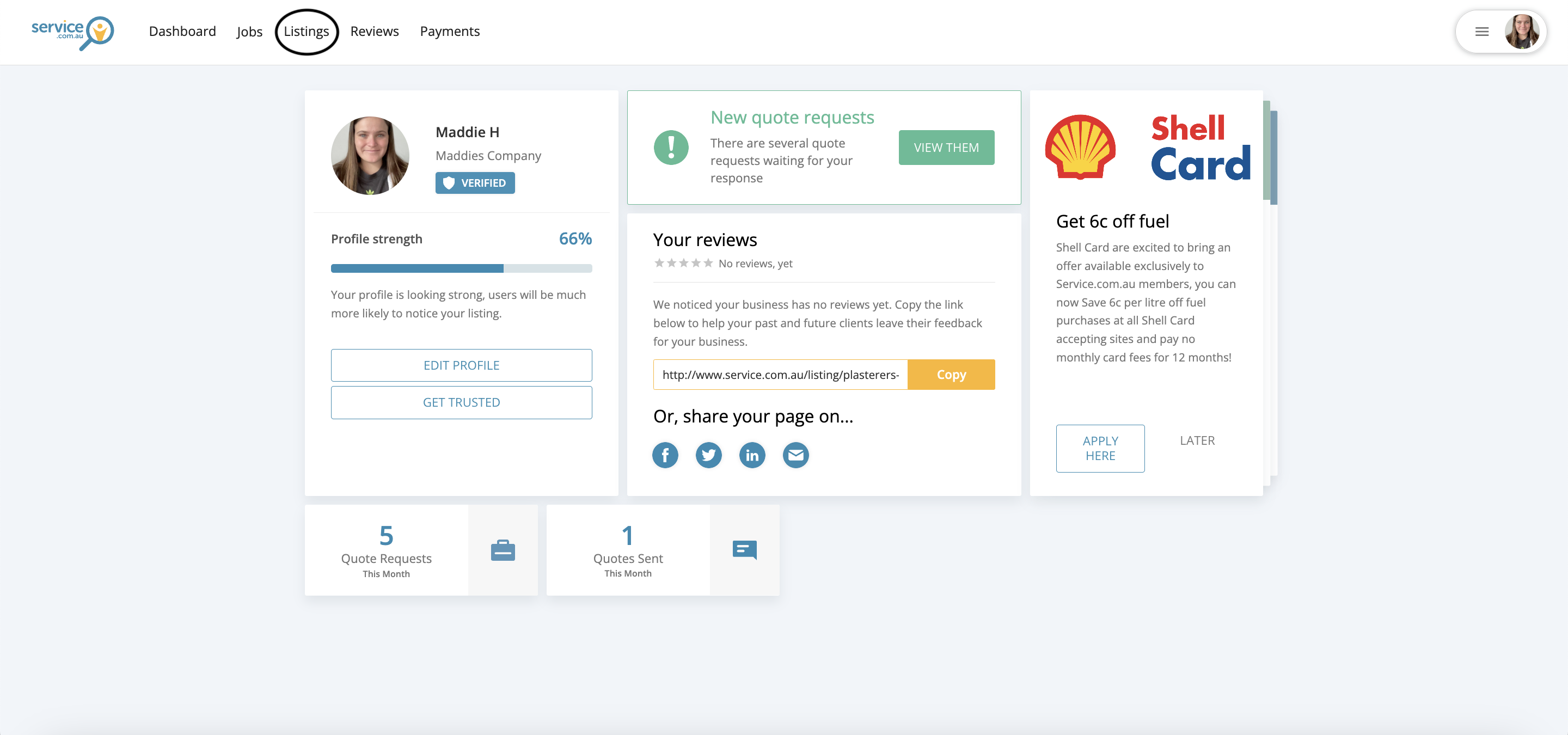 The Listings section in the account dashboard