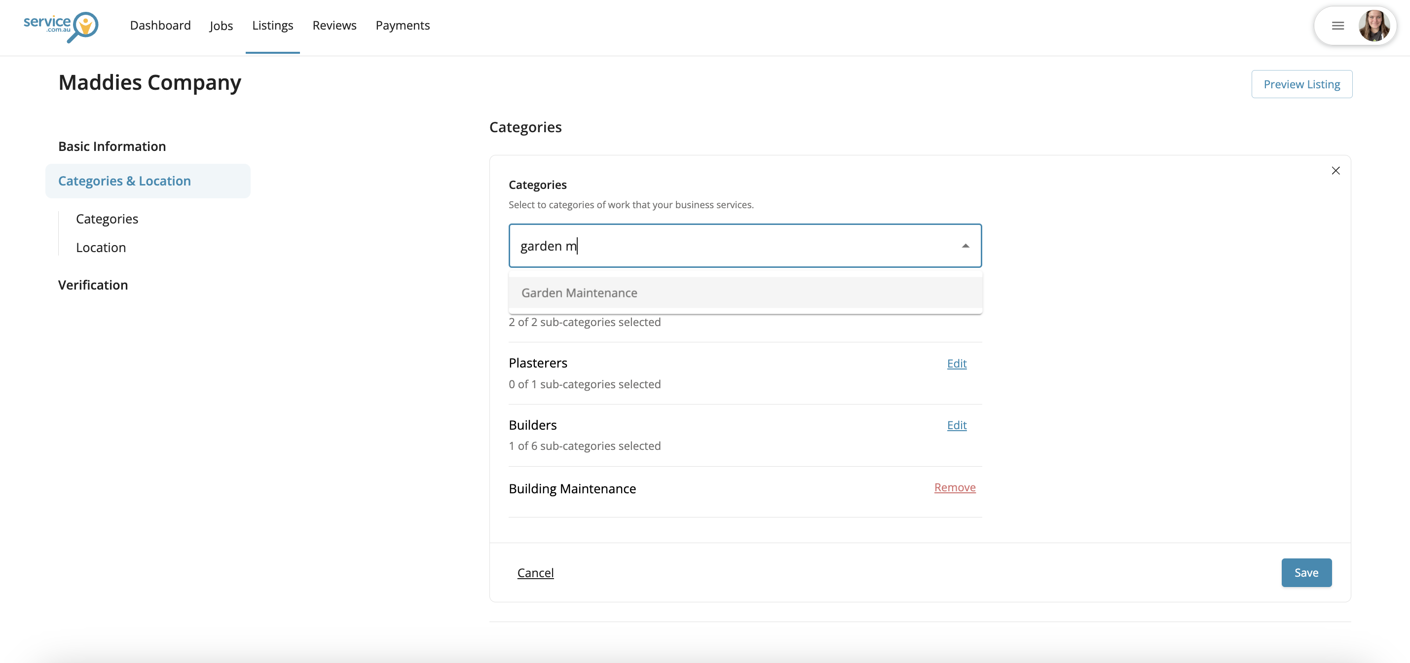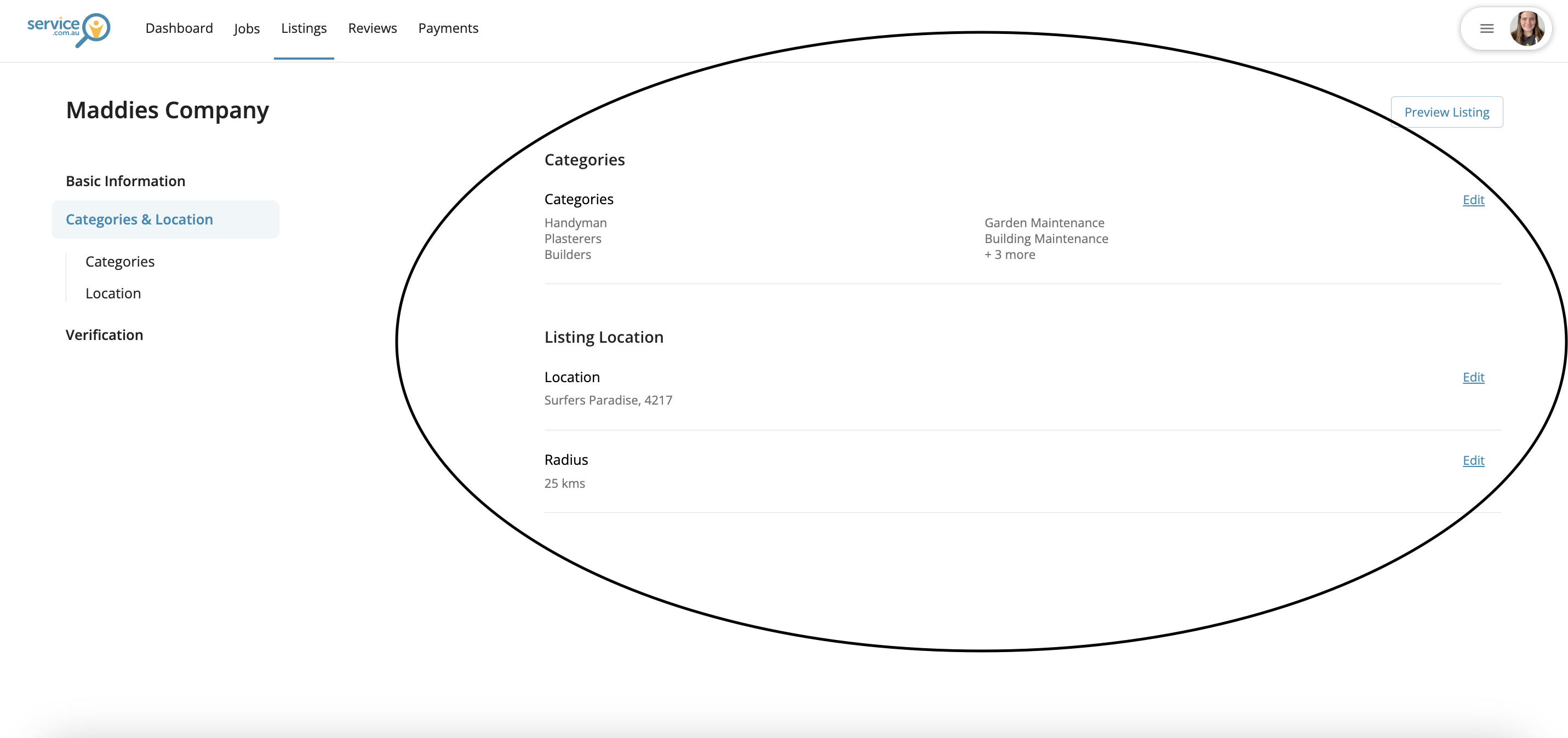 Click on Edit next to the section you want to update, then enter your new service categories, business location, or travel distance.