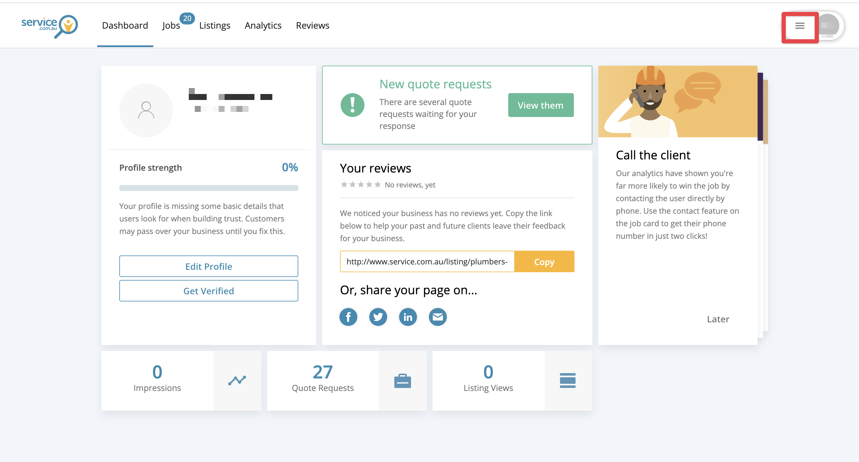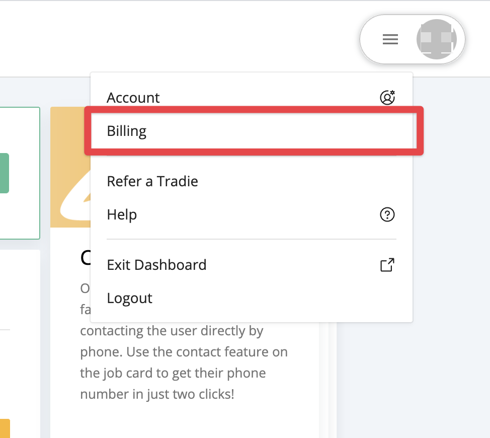 Log in to your account dashboard and click on the Menu button in the top right corner.