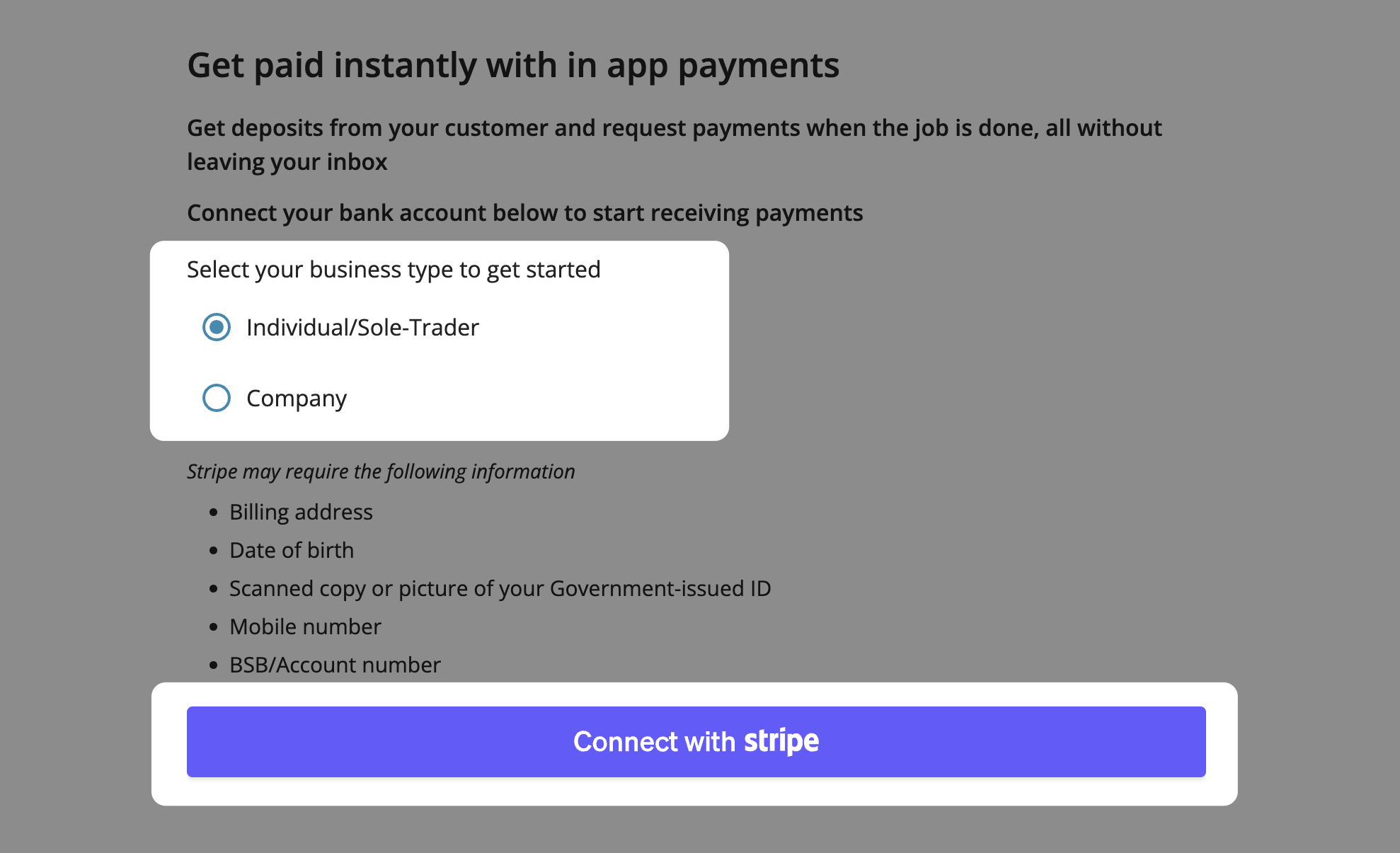 - You need to connect your bank account through Stripe before you can send payment requests.
