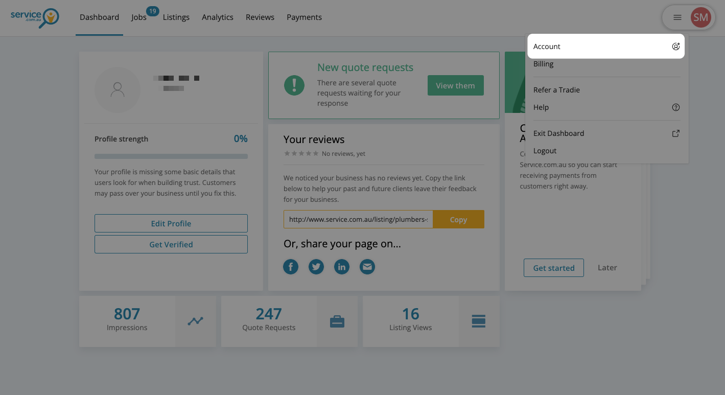 Service.com.au processes payments through Stripe, so you can request payment for quoted or completed jobs from your business account.