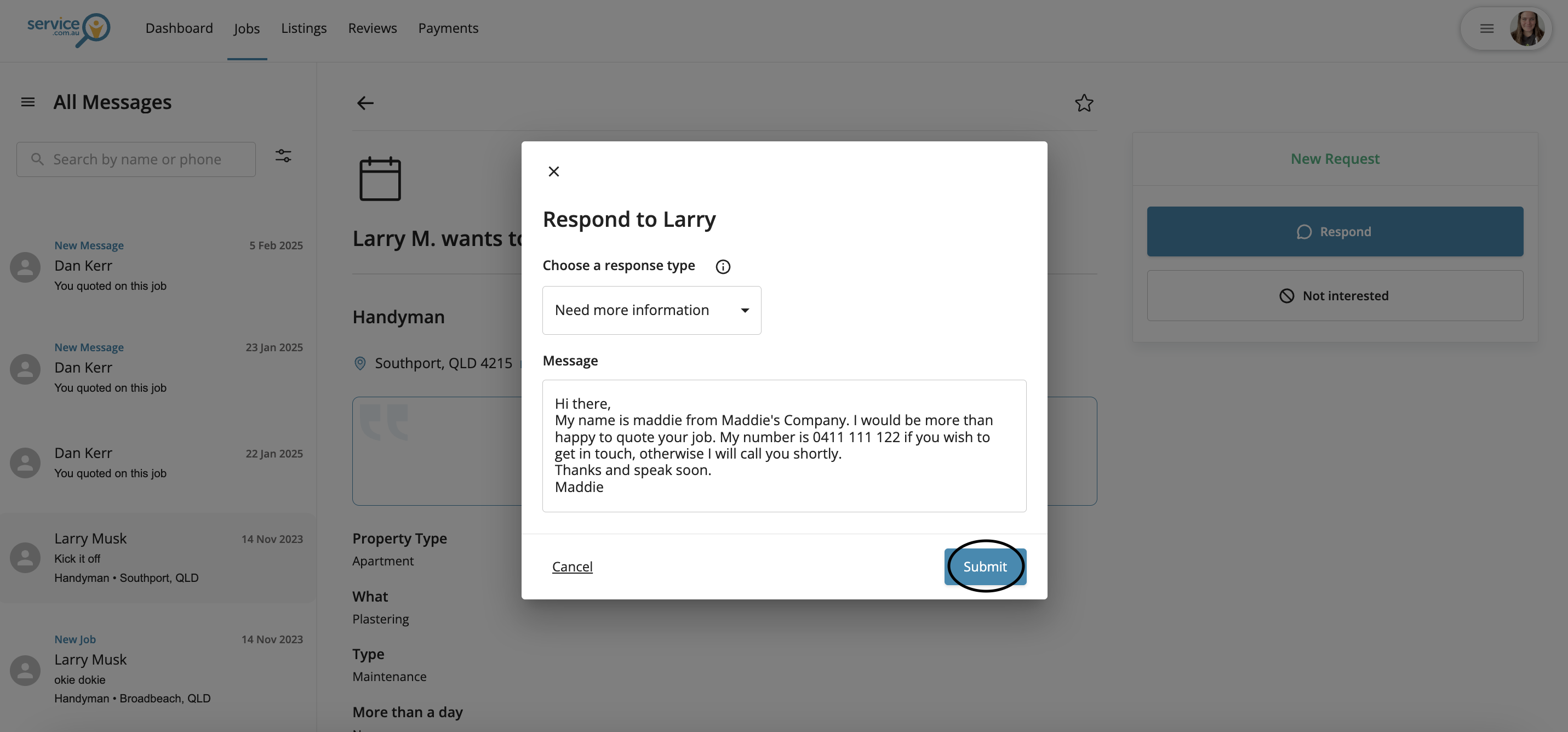 When you respond to a job, your default quote message will appear pre-filled for you to review and send.